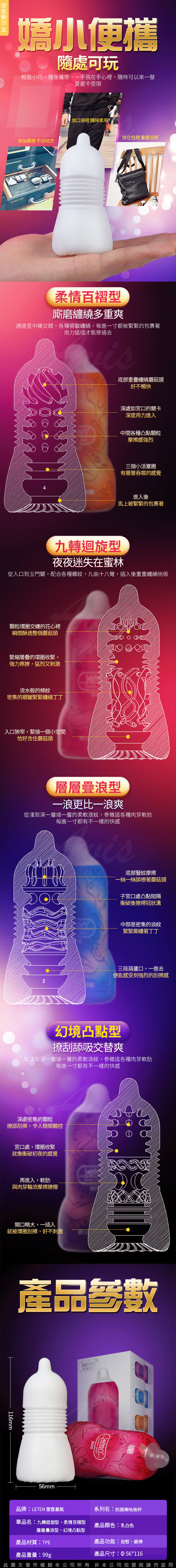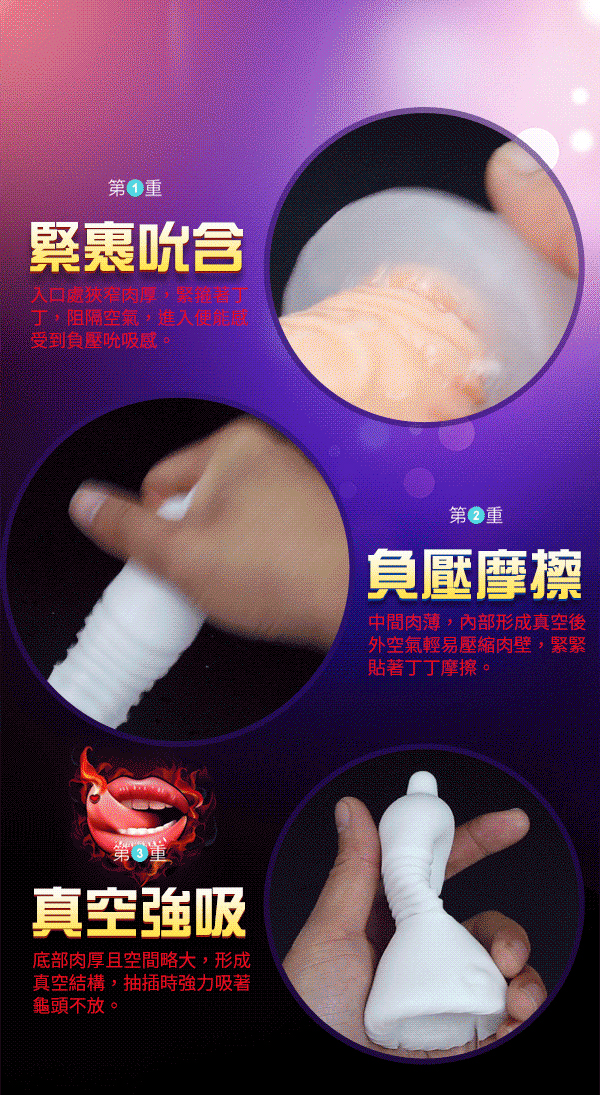 運用幻覺空氣動力構造,推動高潮的進步,給你非同一般的享受爽到欲拔不能~擁有三段負壓真空構造形成強力真空及厚重真實的包裹著老二感增加摩擦感猶如迷失在幻境通道般。採用虛擬膚質材質,柔軟Q彈享受肌膚舒適快感更加銷魂真實練就不倒金剛槍。