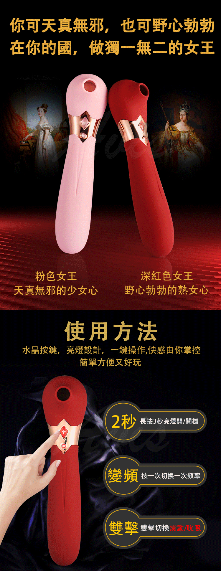 如果你想要通過刺激陰蒂體驗潮吹的神仙感覺,S4女王是你最好的選擇,她能滿足你們所有對潮吹的想像。和市面上所有吸震玩具一樣,它也是一款通過吮吸和震動來刺激陰蒂引爆高潮的玩具。但是S4女王是一款經過改良後能超越他們的神器。全身非常柔軟,內置5種吮吸10種震動強度,自主選擇吮吸力度大小,能由外至內地傳遞震顫快感,讓你能夠達到高潮至潮吹快感。