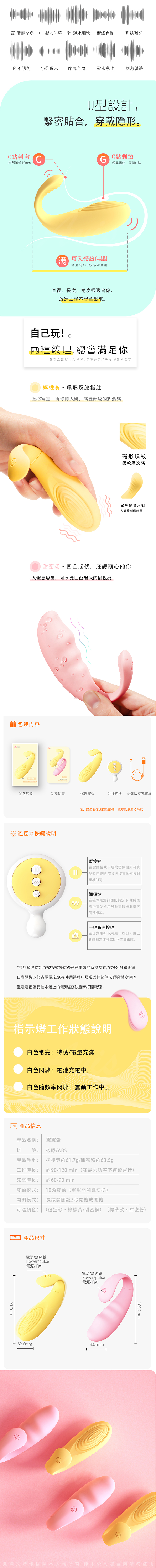 10種頻率不同玩法。跳蛋採U型彈性尾部溫柔貼合人體外肛/陰部線條,讓您可外出使用,搭配無線遙控讓您與愛人更加貼近喔